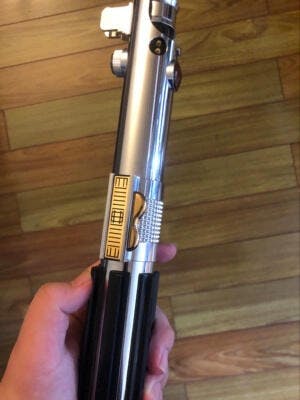 Designed for optimal functionality, the Anakin EP3 saber offers a comfortable grip, enabling wielders to execute precise strikes and swift movements with ease. The grip showcases distinctive black ribbed plating, ensuring a firm hold even in the most intense moments. The center of the saber houses a strategically placed control box, seamlessly integrated into the design. A gold decorative finish adds an extra touch of sophistication to this central element.